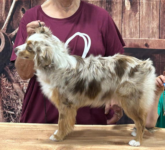 GENERAL APPEARANCE- The Australian Shepherd is a well-balanced dog, He is attentive and animated, showing strength and stamina combined with unusual agility. Slightly longer than tall, he has a coat of moderate length and coarseness with coloring that offers variety and individuality in each specimen. An identifying characteristic is his natural or docked bobtail. Bone is moderate and clean.
