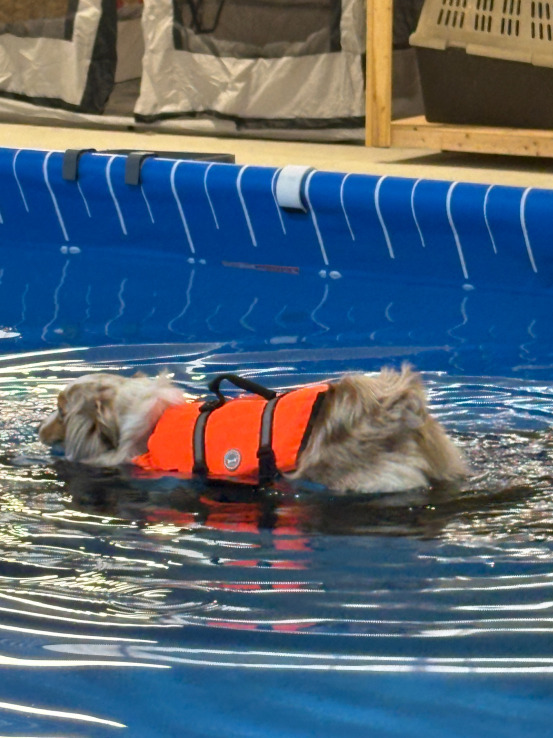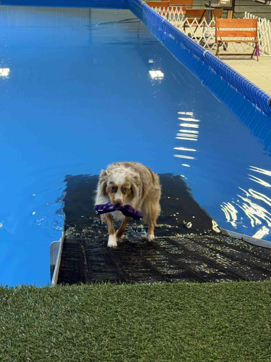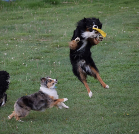 She is a perfect example of the versatility of an Aussie. She loves to catch a frisbee with great athletism, she is great at dog agility, she loves to go hiking, she used to herd the chickens when we free ranged them and if I'm swimming she will swim with me. I retired her after having 8 litters.